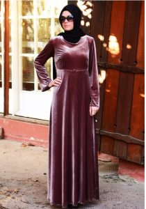 Mürdüm rengi, parlak ve kadife kumaşı ile fazla detaya sahip olmayan bu elbise göz alıcı ışıltısı ile tek başına bile dikkat çekici.
